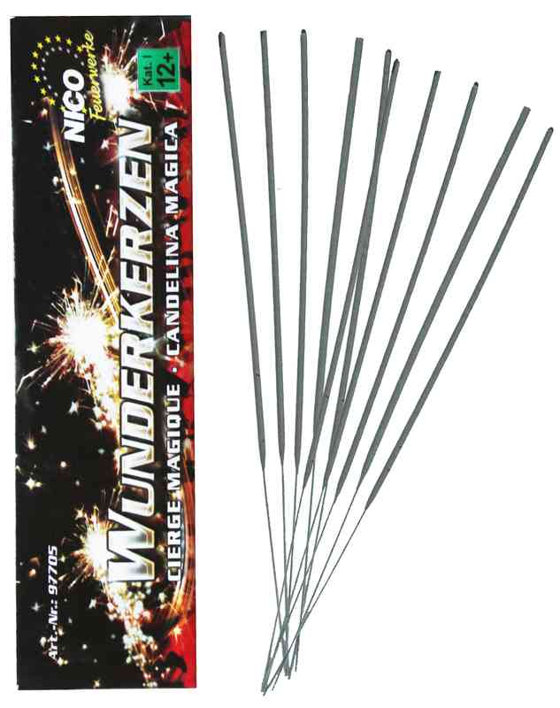 Wunderkerzen: ca. 17cm Lang mit ca. 30 Sekunden Brenndauer. Achtung Funkenflug, kleine Brandlöcher auf Teppichen, Kleider und Kunstleder nicht auszuschliessen.